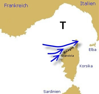 Das Cap Corse ist eine stürmische Ecke. Ebenso wie die Strasse von Bonifacio. Damit sagt man niemandem etwas Neues. Aber es lohnt sich, etwas genauer hinzuschauen. Der Starkwind kann auch im Sommer für Nordkorsika bis hinüber nach Elba manchmal plötzlicher und heftiger kommen als gedacht. Der Kern des Problems liegt darin, dass die athmosphärischen Prozesse gelegentlich eine so schnelle und unvermutete Wendung nehmen, dass kein Wetterbericht mehr rechtzeitig warnen KANN - auch nicht der französische. Ausgangspunkt ist stets ein Tiefdruckgebiet irgendwo im Bereich Côte d´Azur / Norditalien. Sei es als flaches Wärmetief vor der Côte d´Azur, sei es als Leetief ´hinter´ den Alpen. Es wird in der Regel rechtzeitig vom Wetterbericht gemeldet, auch die Tatsache, ob es sich weiter vertiefen oder eher abbauen wird. Das im Bereich Nordkorsika entstehende Windfeld liegt damit weitgehend fest - wie in der folgenden Skizze angedeutet. |