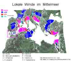 Die einzigartige Geographie dieses Meeresbeckens führt dazu, dass die meisten Starkwinde und Stürme zur Kategorie der lokalen Winde (Mistral, Tramontane, Libeccio, Scirocco, Ethesian / Meltemi, Bora, Shamsin) gehören und in Stärke,