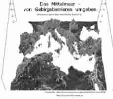 In der Mitte - Das Mittelmeer Das Mittelmeer ist umgeben von einer beinahe geschlossenen Barriere von Gebirgen mit Gipfelhöhen zwischen 1500 und nahe 5000 m. Diese rufen eine relative Isolation der mediterranen gegenüber den umgebenden Luftmassen