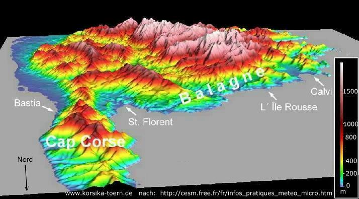 Von Norden gesehen zeigt sich die geschützte Lage des Golf von St. Florent inmitten der umliegenden Gebirgszüge - im Unterschied zu der exponierten Situation der Balagne und des Cap Corse. Bei den